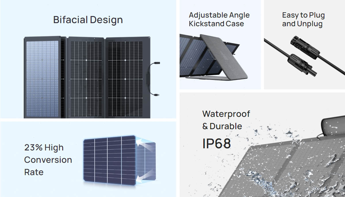 Đây chính là "phép thuật" của tấm pin 220W. Với một mặt chính 220W để thu ánh sáng trực tiếp và một mặt sau 155W để thu ánh sáng xung quanh và phản xạ từ mặt đất, bạn có thể thu được thêm tới 25% năng lượng. Điều này đồng nghĩa với việc sạc đầy trạm điện của bạn nhanh hơn, đặc biệt hiệu quả trên các bề mặt phản chiếu như tuyết, nước, hoặc thậm chí là cát sáng màu.