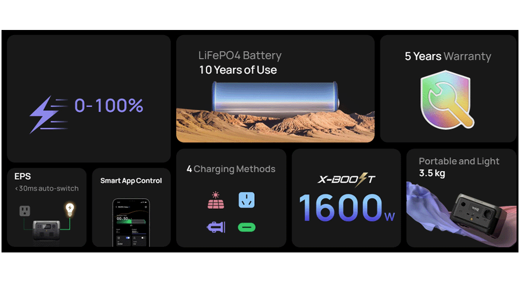 Với công suất mặc định 500W, RIVER 2 Max còn được trang bị công nghệ X-Boost độc quyền, cho phép đẩy công suất đầu ra lên đến 1000W. Điều này giúp bạn cấp nguồn cho nhiều thiết bị có công suất cao hơn, mở rộng đáng kể khả năng sử dụng của trạm sạc, từ máy sấy tóc nhỏ đến ấm đun nước du lịch.