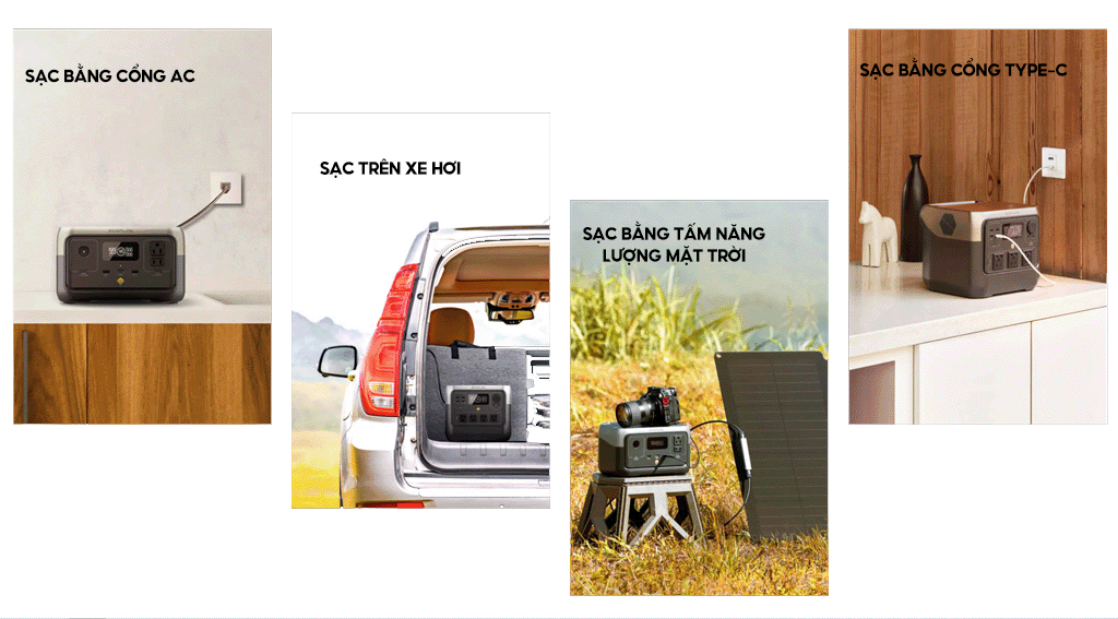 Sạc năng lượng mặt trời: Tận dụng nguồn năng lượng sạch từ mặt trời với tấm pin EcoFlow (mua riêng).